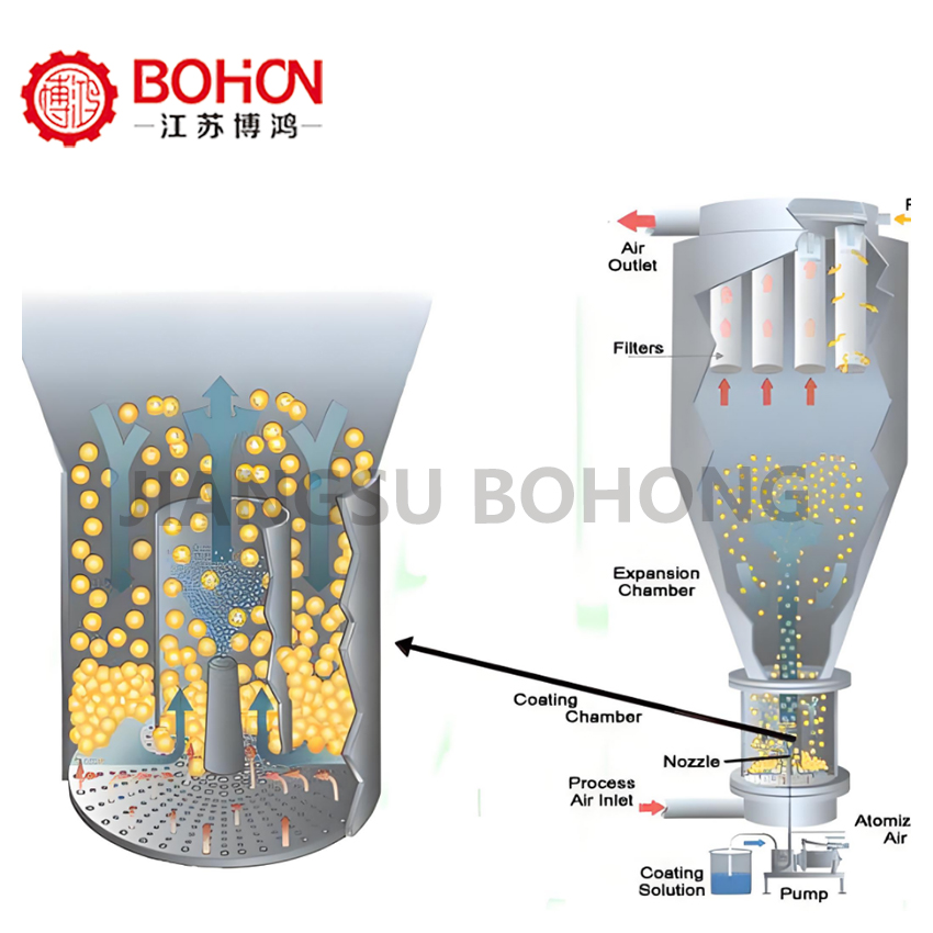 产品简介:The FPCG Series Fluidized Bed Granulation and Coating Machine is an advanced equipment independently designed and manufactured by Jiangsu Bohong, specifically developed for granulation and coating processes in the pharmaceutical and chemical industries.