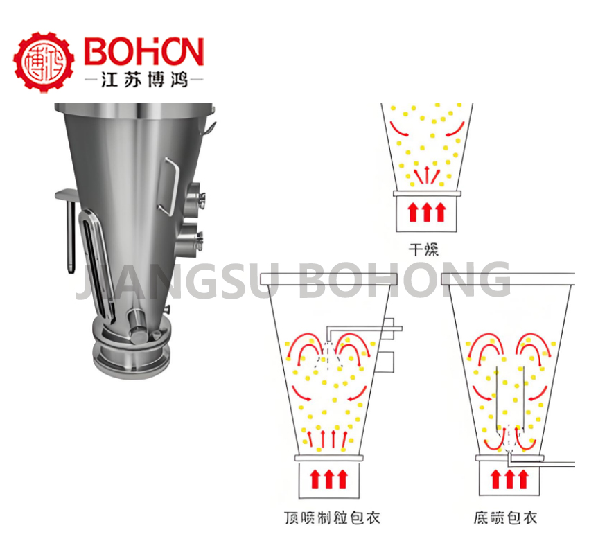 3. **Coating**: The bottom and side spray functions allow for coating operations on granules or microspheres to improve drug release performance or protect the material.